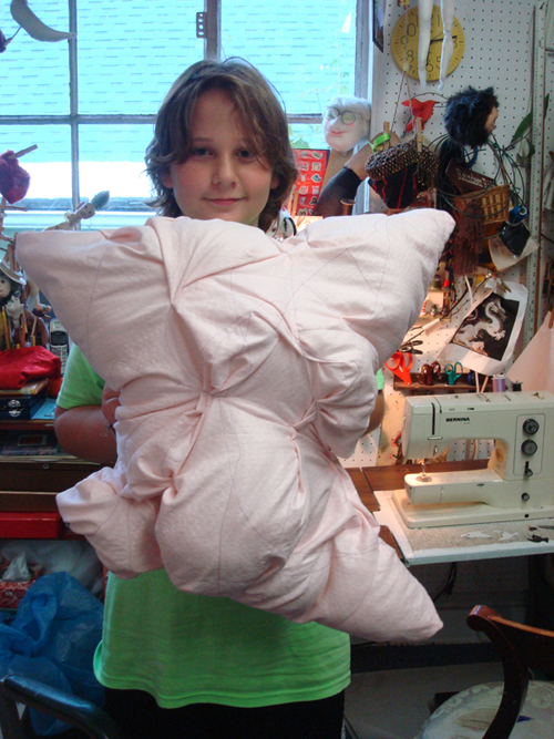 This responsible young man wanted to use the sewing machine, which he’d never done before; he’d been observing others though. I didn’t even have to do it with him this first time. I gave him some verbal directions and a piece of fabric. He stitched and folded finally coming up with this outrageous soft sculpture. Notice his pride and delight.